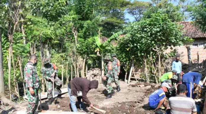 Serka Kuspriyanto bersama tiga orang rekannya dari Koramil tipe B 0802/06 Sukorejo melaksanakan karya bakti rehab rumah warga di Dukuh Wetan, Desa Karanglo Lor, Kecamatan Sukorejo, Kabupaten Ponorogo.