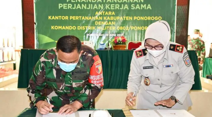 Terkini.id, Ponorogo - Kodim 0802/Ponorogo bersama Badan Pertanahan Nasional (BPN) Kabupaten Ponorogo melaksanakan penandatanganan Memorandum of Understanding (MoU) di Gedung Pamungkas Kodim 0802/Ponorogo, Rabu 16 Juni 2021.