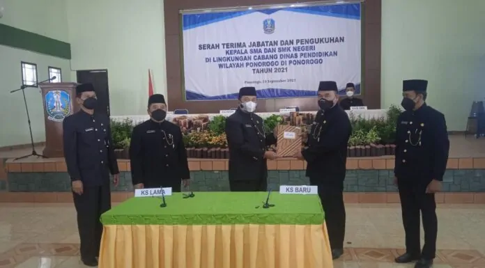 Terkini.id, Ponorogo - Beberapa sekolah tingkat SMA / SMK melakukan mutasi Kepala Sekolah. Pengukuhan dan serah terima jabatan (sertijab) dilakukan oleh Kepala Cabang Dinas Pendidikan Wilayah Ponorogo (Kacabdin) di Aula SMAN 2 Ponorogo, Jum'at 10 September 2021.