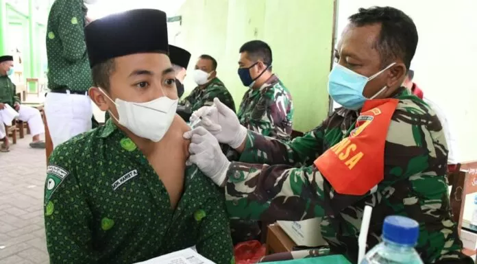 Terkini.id, Ponorogo - Vaksinasi pelajar dan santri di Ponorogo terus dilakukan oleh Pemerintah, Sabtu 2 Oktober 2021 di Ponpes Al-Islam Joresan Mlarak Ponorogo dan Rabu 6 Oktober 2021 di Ponorogo City Center (PCC). Pelaksanaan vaksinasi dilakukan secara bertahap untuk mencegah terjadinya kerumunan. Disiplin protokol kesehatan selalu diutamakan bahkan dalam pelaksanaan vaksinasi.