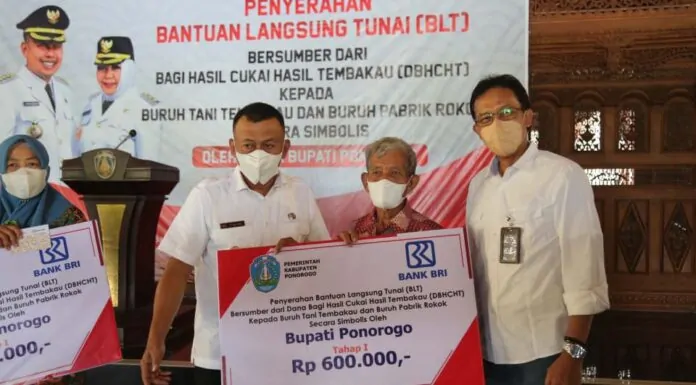 Terkini.id, Ponorogo - Petani tembakau yang terdampak pandemi di Ponorogo mendapat angin segar. Bupati Ponorogo Sugiri Sancoko memberikan Bantuan Langsung Tunai (BLT) pada petani tembakau dan buruh pabrik rokok. Penyerahan simbolis dilaksanakan dengan prokes di Pendopo Agung Ponorogo, Rabu 1 Desember 2021.