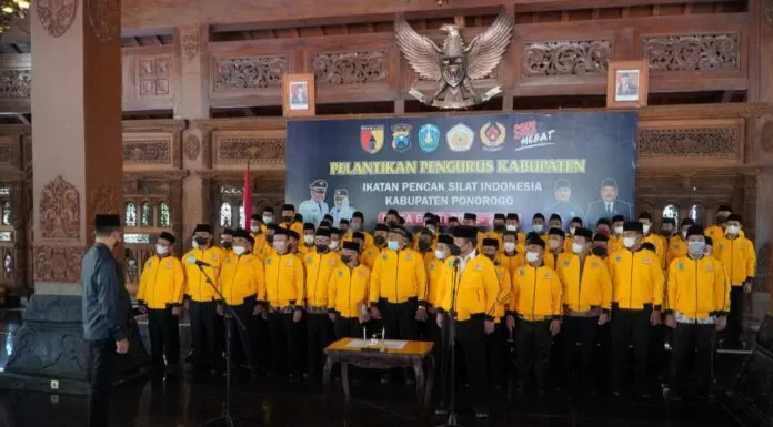 Terkini.id, Ponorogo - Bupati Sugiri Sancoko melakukan pelantikan pengurus Ikatan Pencak Silat Indonesia (IPSI) Kabupaten Ponorogo masa bakti 2021 - 2025 di Pendopo Agung Kabupaten, Rabu 12 Januari 2022. Pelantikan mengambil tema "Dengan Semangat Kebhinekaan Kita Pupuk Persatuan dan Kesatuan Dalam Melestarikan Budaya Pencak Silat Menuju Prestasi Dunia".