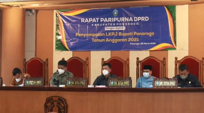 Terkini.id, Ponorogo - DPRD Kabupaten Ponorogo menggelar rapat paripurna di Ruang Sidang Paripurna, Senin 28 Maret 2022. Agenda rapat itu adalah Penyampaian Laporan Keterangan Pertanggungjawaban Bupati Ponorogo.