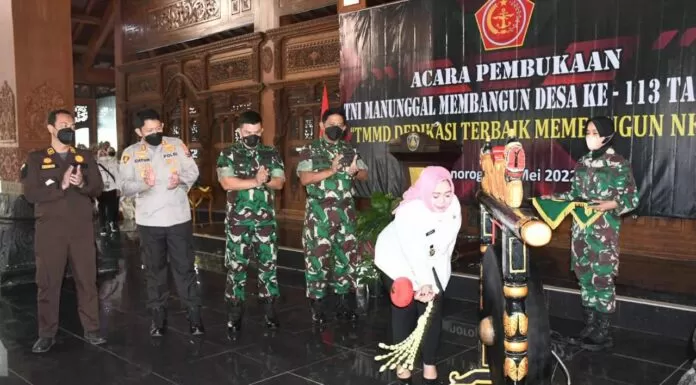 Terkini.id, Ponorogo - Kodim 0802/Ponorogo menggelar pembukaan program TMMD (TNI Manunggal Membangun Desa) ke-113 TA 2022. Pembukaan berlangsung di Pendopo Agung Kabupaten, Rabu 11 Mei 2022. Pembukaan dihadiri oleh Wakil Bupati Lisdyarita, Pamen And Sishanneg Pangdam V/BRW Kolonel Inf Leonardus Kuras Wibisono, Dandim 0802/Ponorogo Letkol Inf Muhammad Radhi Rusin, Kapolres Ponorogo AKBP Catur C. Wibowo, Kasi Pidsus Kajari Agus Kurniawan, Danyon Armed 12/155 GSIAY/272 Kostrad, Danyon Paskhas 463 Lanud Iswahyudi, Perwakilan OPD Ponorogo, Forpimka Ngrayun dan Kepala Desa Cepoko.